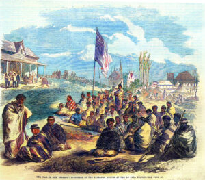 Image ref. Surrender of Maori at Te Papa, 25 July 1864 showing High Trees (left), the Native Institute (centre,) Illustrated London News (29 Oct 1864,) University of Waikato, taurangahistorical.blogspot.com. AHNZ enhanced (2025)