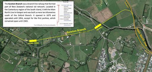 The route drawn on the map is inaccurate as the line did not run in a straight line after leaving the Main North [rail] Line as the line passed through Waverly, past Wilson’s Siding, Wetheral, Ohoka, Mandeville North and Swannanoa and those locations are absolutely not in a straight line en-route to West Eyreton and Horrelville.