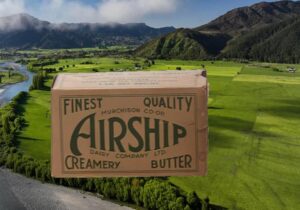 “By 1909, the population of Murchison was 300.25 The first dairy factory was opened in 1909, producing the ‘Airship’ brand of butter, which was transported by wagon to the railhead at Kohatu at night to keep it in good condition. The factory closed in 1973.” – Joy Stephens, The Prow (2017)