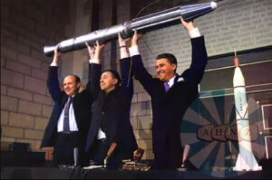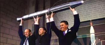Image ref. Explorer 1 model held aloft by Pickering, Van Allen, von Braun; NASA P8485