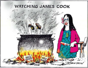 Garrick Tremain created a similar scene in 2023 with his Watching James Cook cartoon (left.) It shows Cook being deingrated as food by yet another Woke White Liberal woman with a tiki around her neck. The cooking fire is fueled by Arts Grants and Arts Awards. It has become mainstream and normal to tear down New Zealand’s former great heros. And, to be paid by the government to do so.